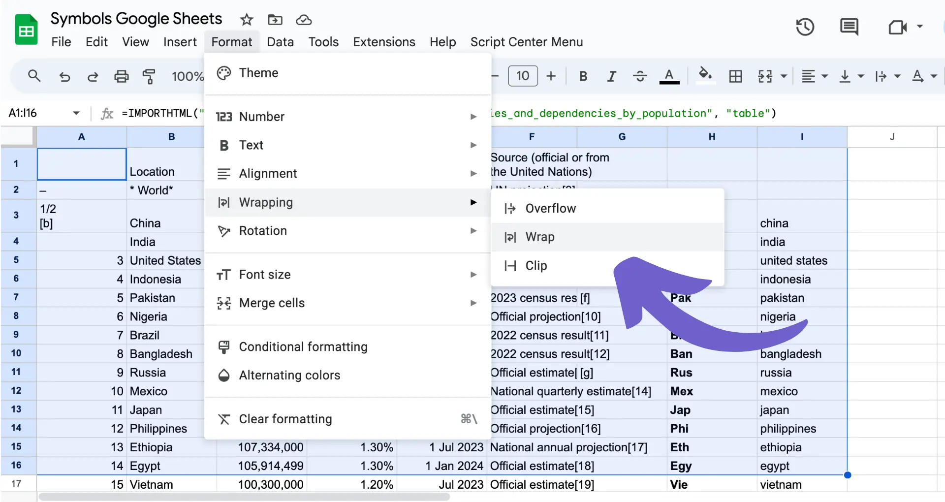 Alternatively, you can access the text wrapping option from the toolbar below the top menu. Simply select the cell or range, then click the text wrapping icon (a diagonal arrow within a square) and choose "Wrap" from the dropdown menu.