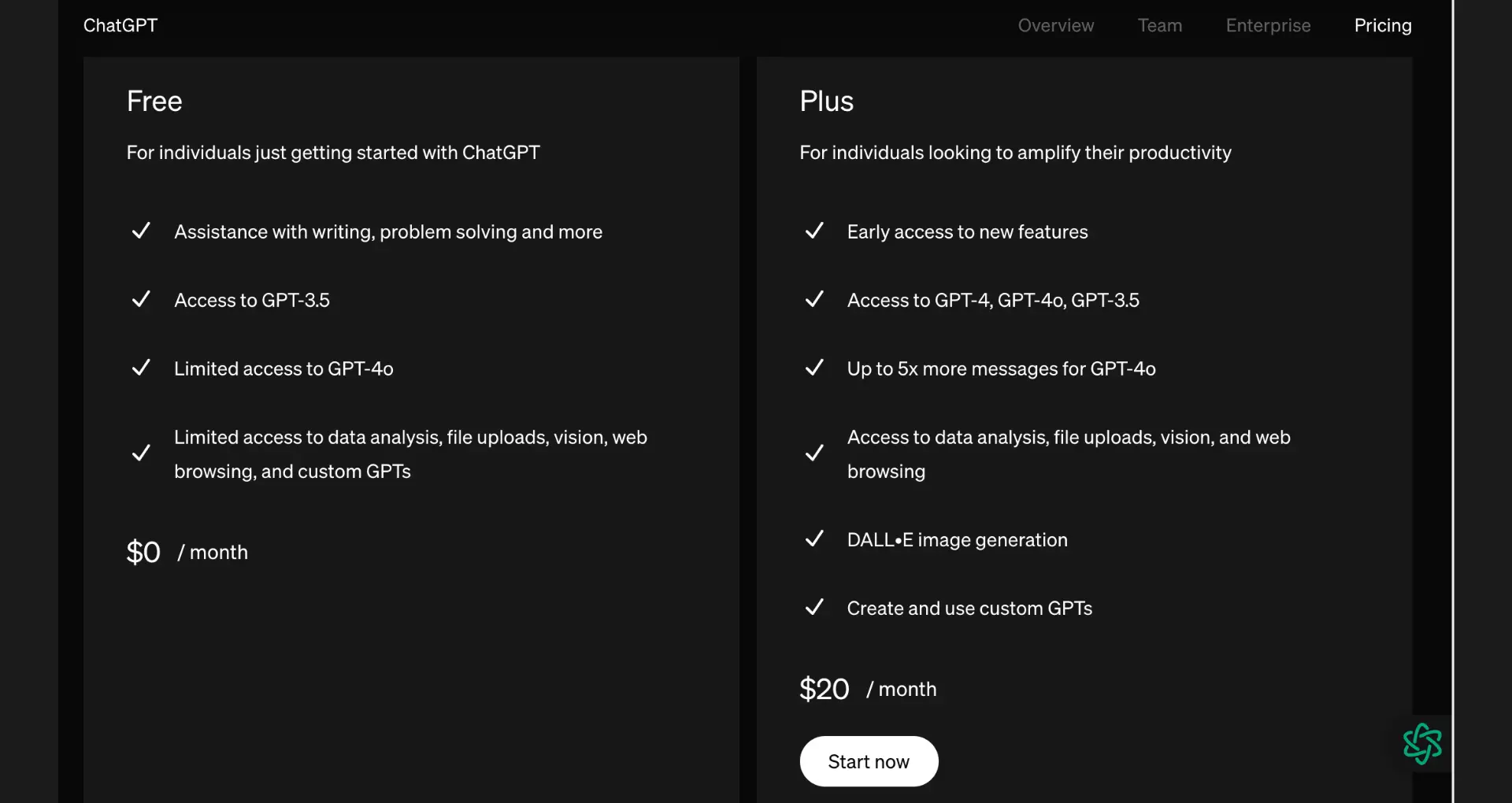 While the free ChatGPT subscription will be suitable if you are just getting started with ChatGPT or have limited needs, you will quickly feel its limitations the more you use it. ChatGPT Plus and Team are designed for individuals and businesses who require more advanced AI capabilities and reliable performance. There is also an Enterprise subscription available with custom packages.