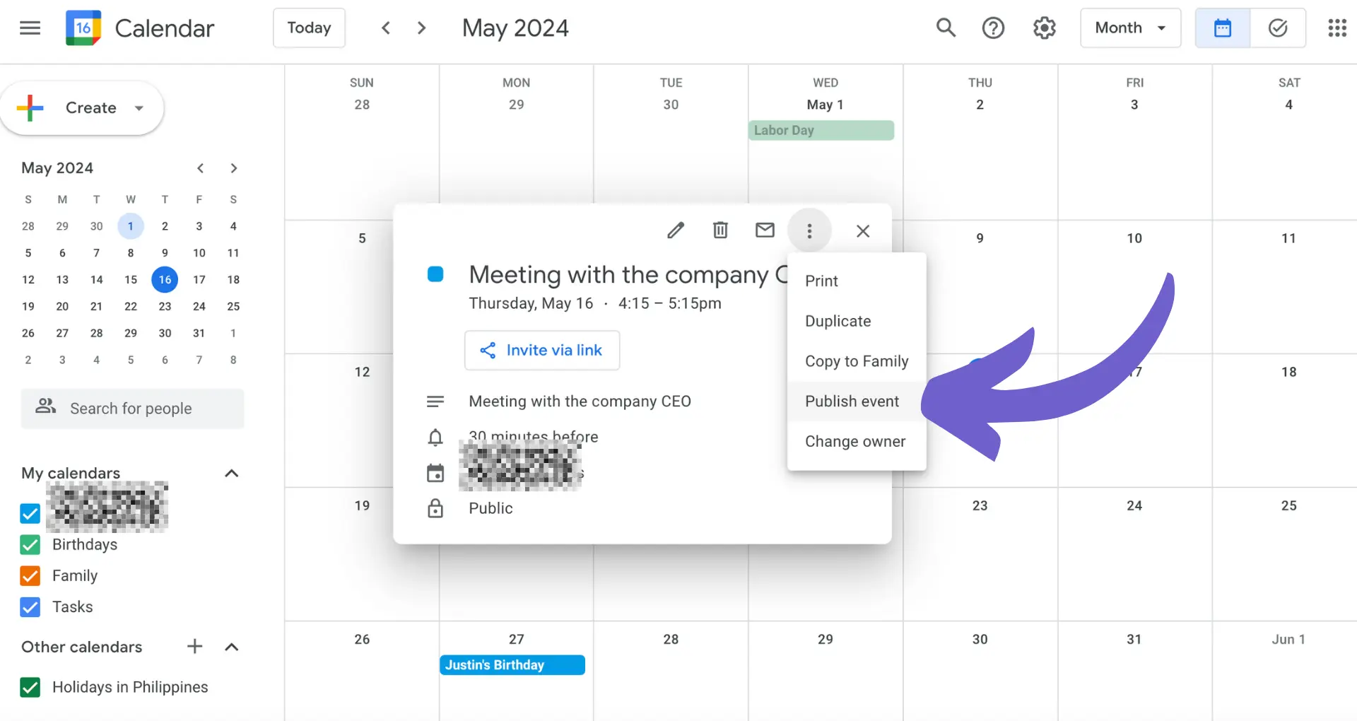 Next, navigate to the event and click on the "More actions" dropdown menu. Select "Publish event" to generate a public link for the calendar event. Copy this link to your clipboard.