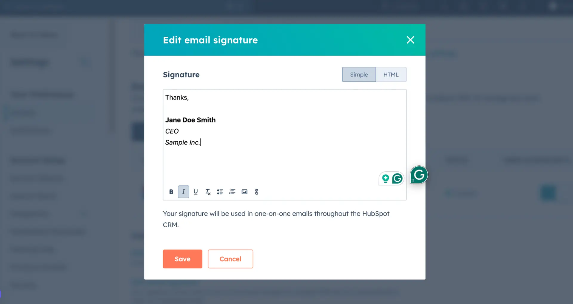 Once you're satisfied with your signature, click "Save" to apply it to your HubSpot emails.