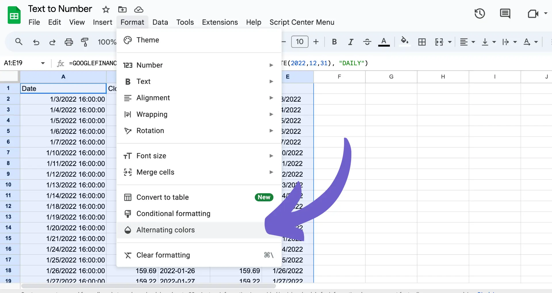 Click on the 'Format' menu in the toolbar and hover over 'Alternating colors.'