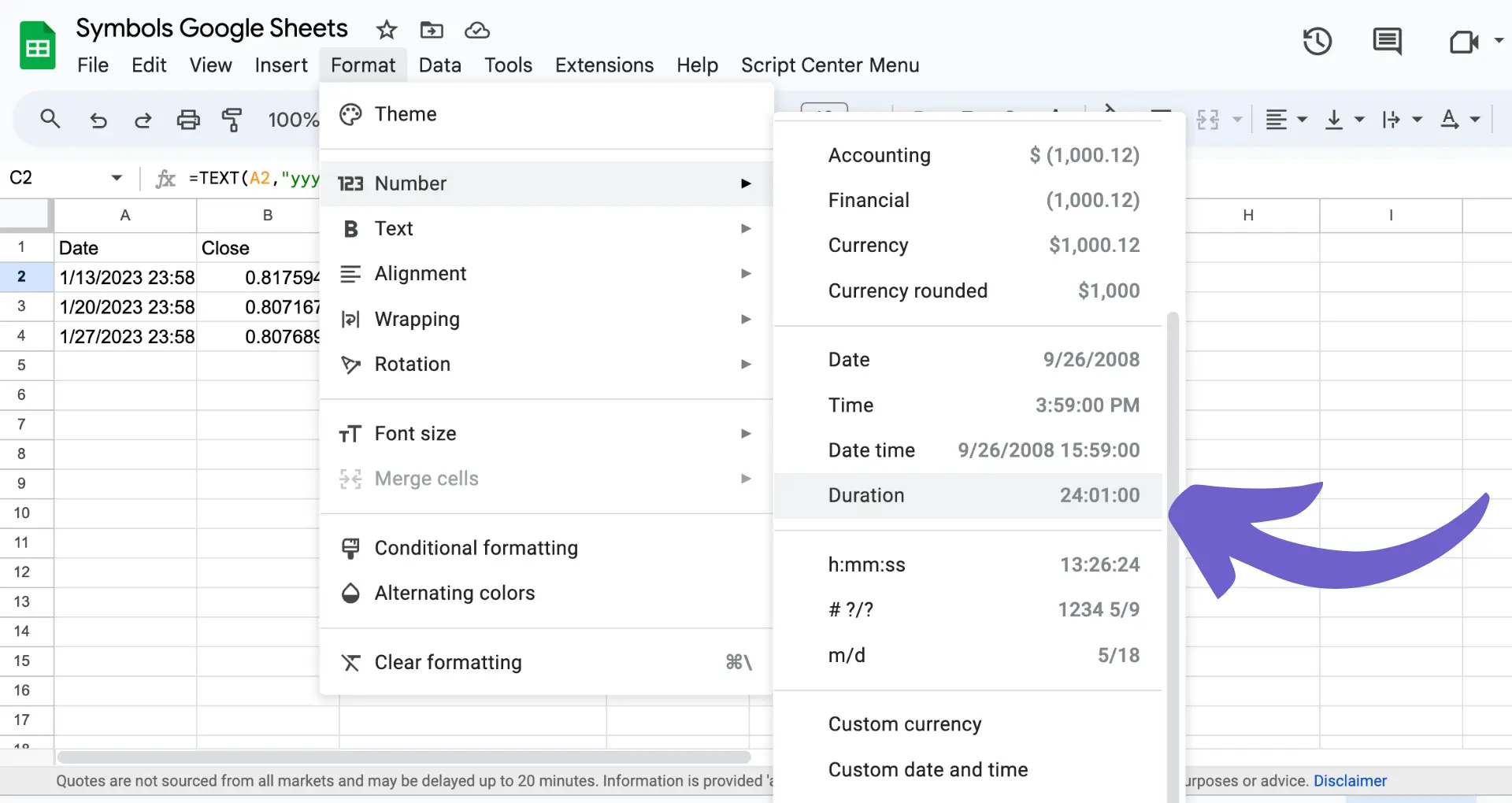 Click on the "Format" menu in the toolbar and choose "Number" followed by "More formats" and then "Custom number format."
