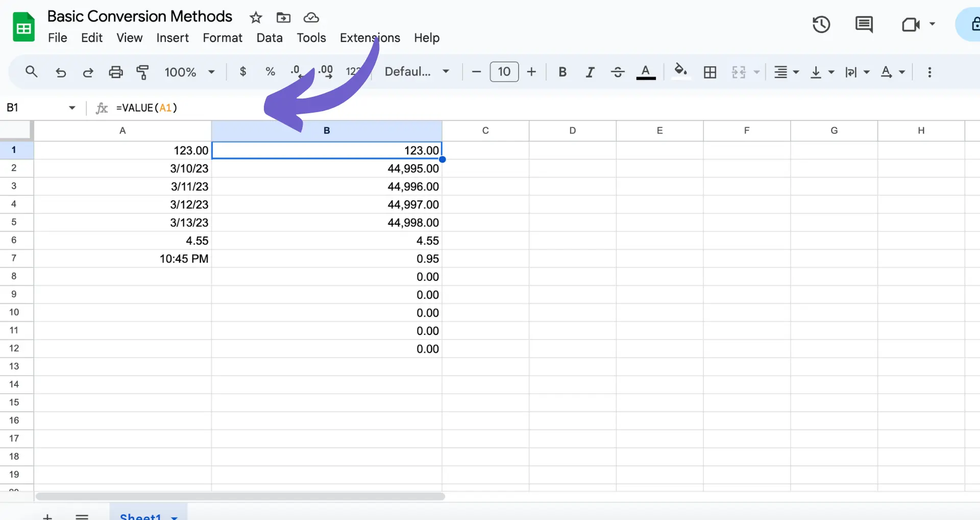 For example, if cell A1 contains the text "123", you can convert it to a number using the formula =VALUE(A1)The VALUE function also works with dates and times, converting them into their corresponding numerical values. Automating these tasks can be even easier with GPT for Google Sheets.