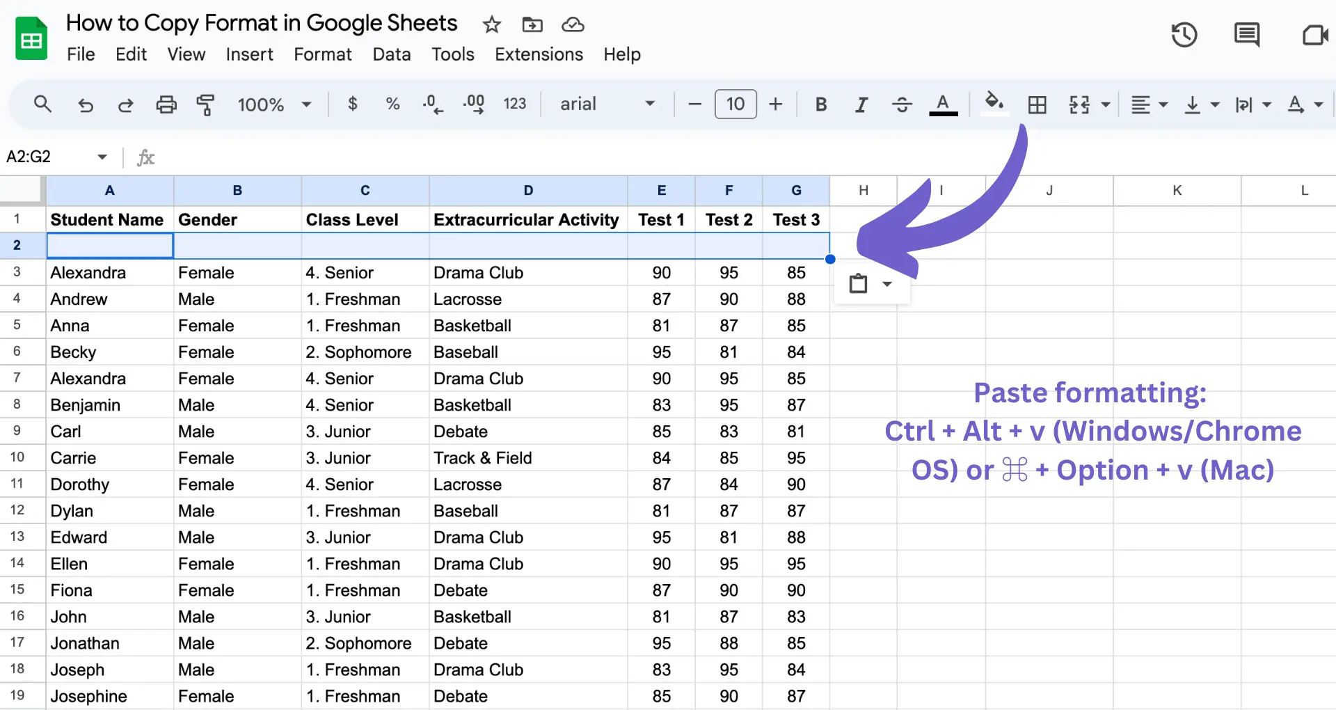 Alternatively, you can use the keyboard shortcut Ctrl+Alt+V on Windows/Chrome OS or ⌘+Option+V on Mac to paste the format directly after copying the source range.