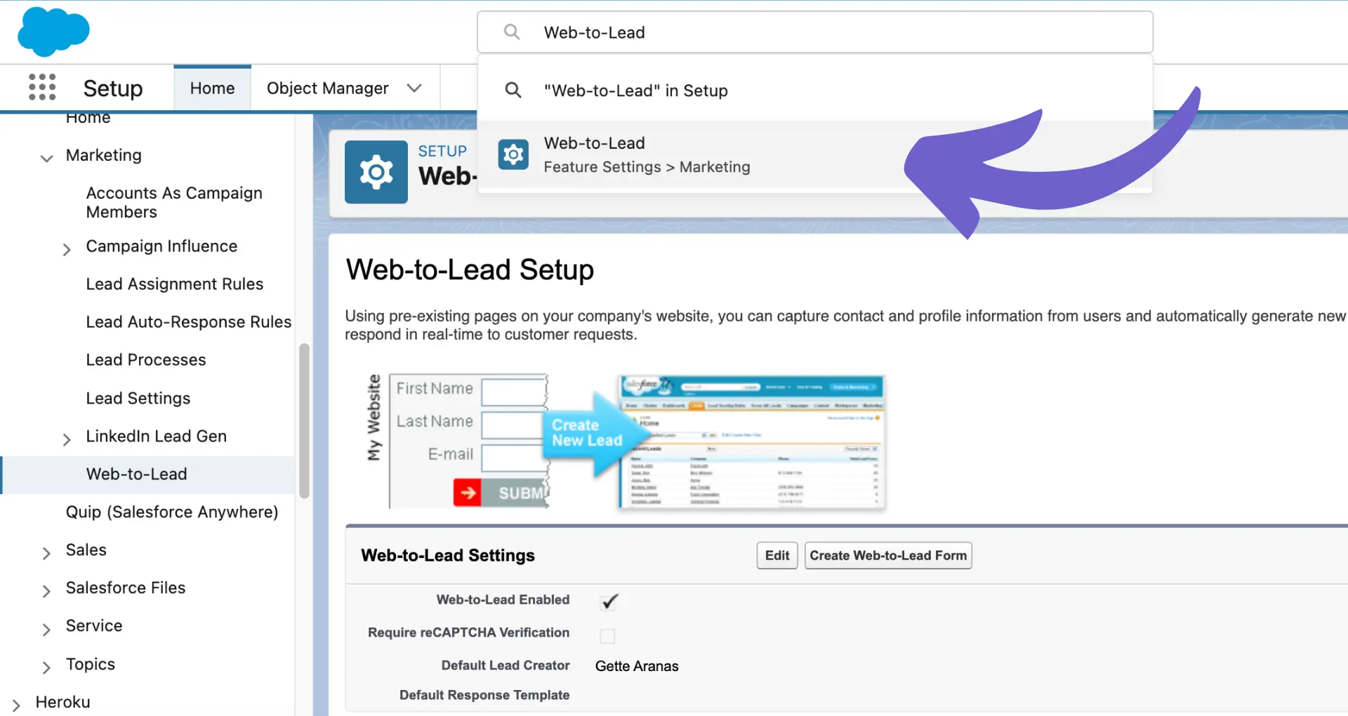 - In the Quick Find box, type "Web-to-Lead" and select "Web-to-Lead" from the search results