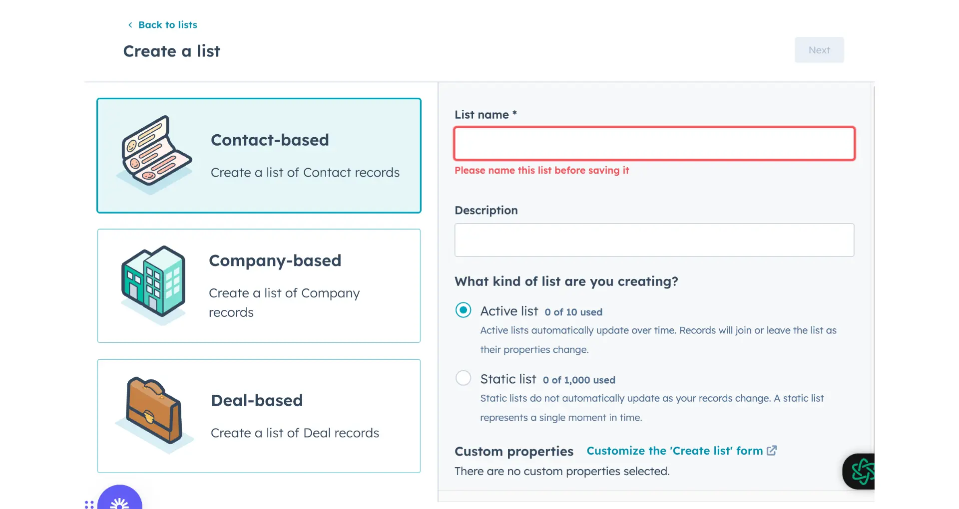 Select the type of list: Contact-based, Company-based, or Deal-based
