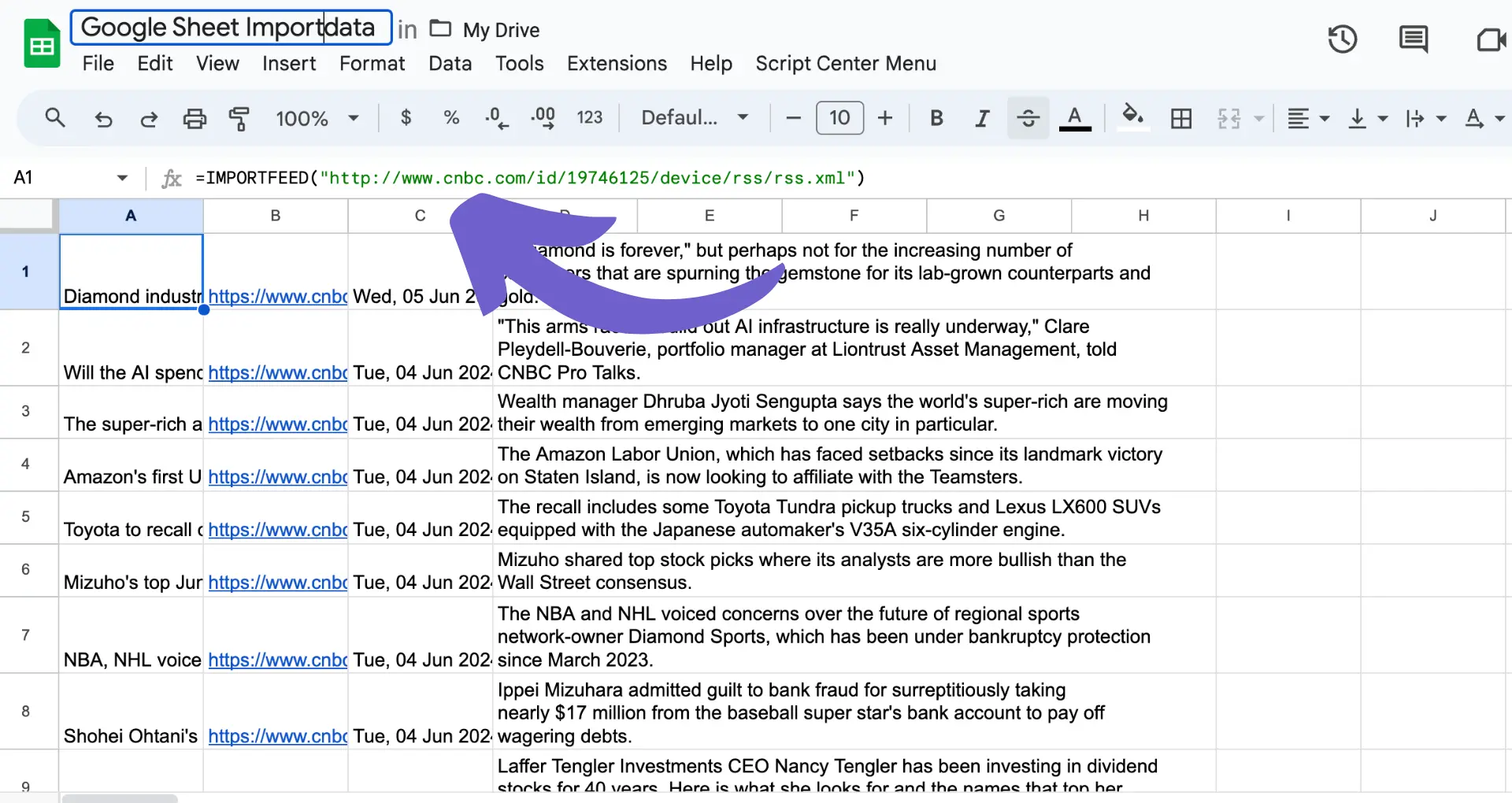 =IMPORTFEED("http://www.cnbc.com/id/19746125/device/rss/rss.xml")
