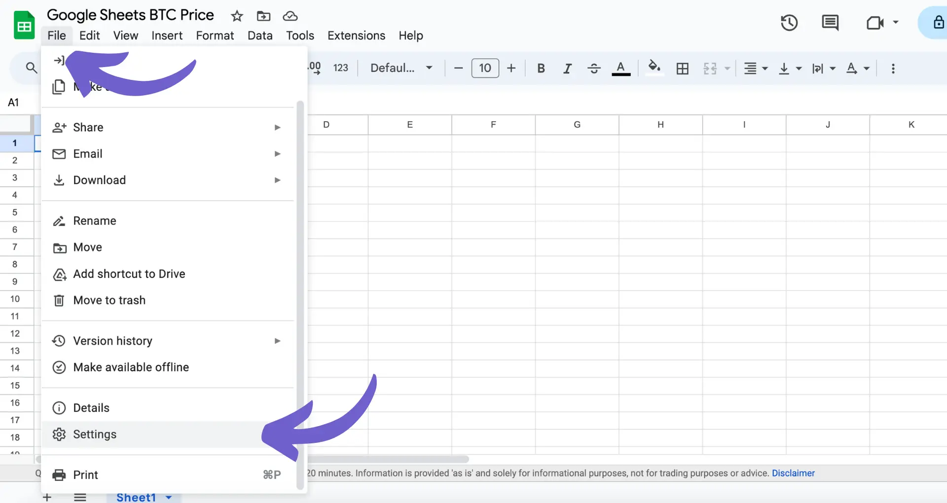 To ensure the price updates regularly, you can adjust the sheet's settings to refresh every minute: