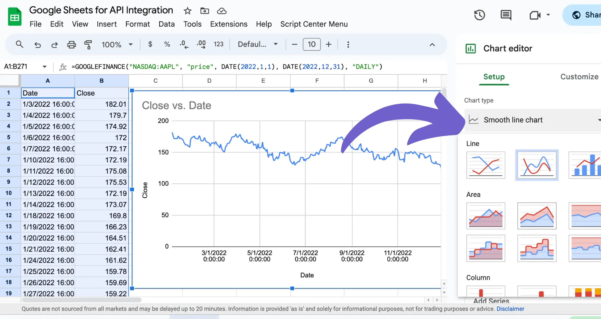 In the Chart Editor, select the appropriate chart type for your stock data. For example, choose a line chart to show price trends over time or a candlestick chart to display open, high, low, and close prices.