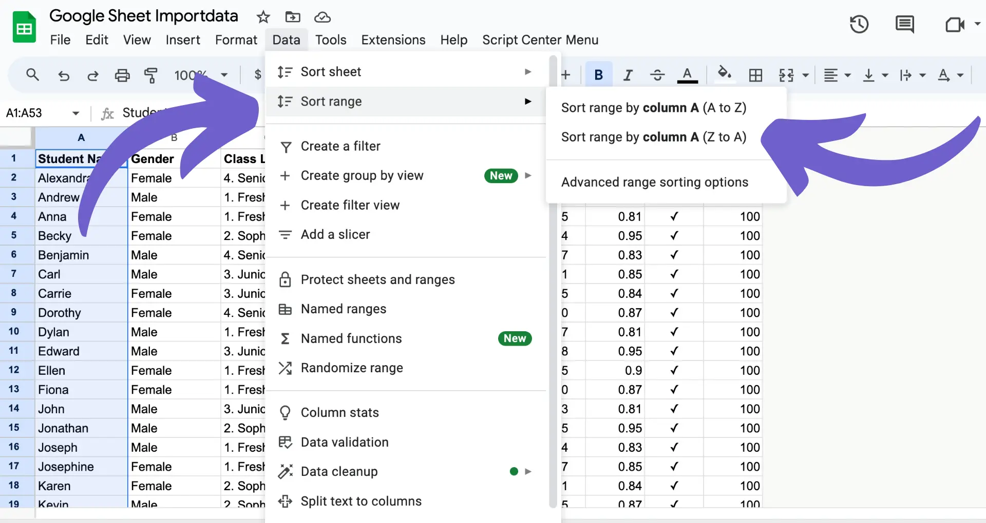 To execute these simple sorting tasks, you can use the sorting toolbar or menu options in Google Sheets. Here's how: