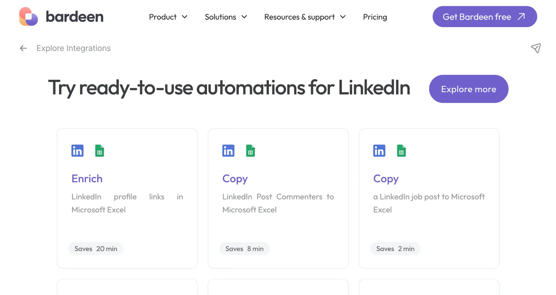 Bardeen integrates broadly with CRMs, communication platforms, lead generation tools, project and task management tools, and customer success tools. These integrations connect workflows and ensure data flows smoothly across systems.