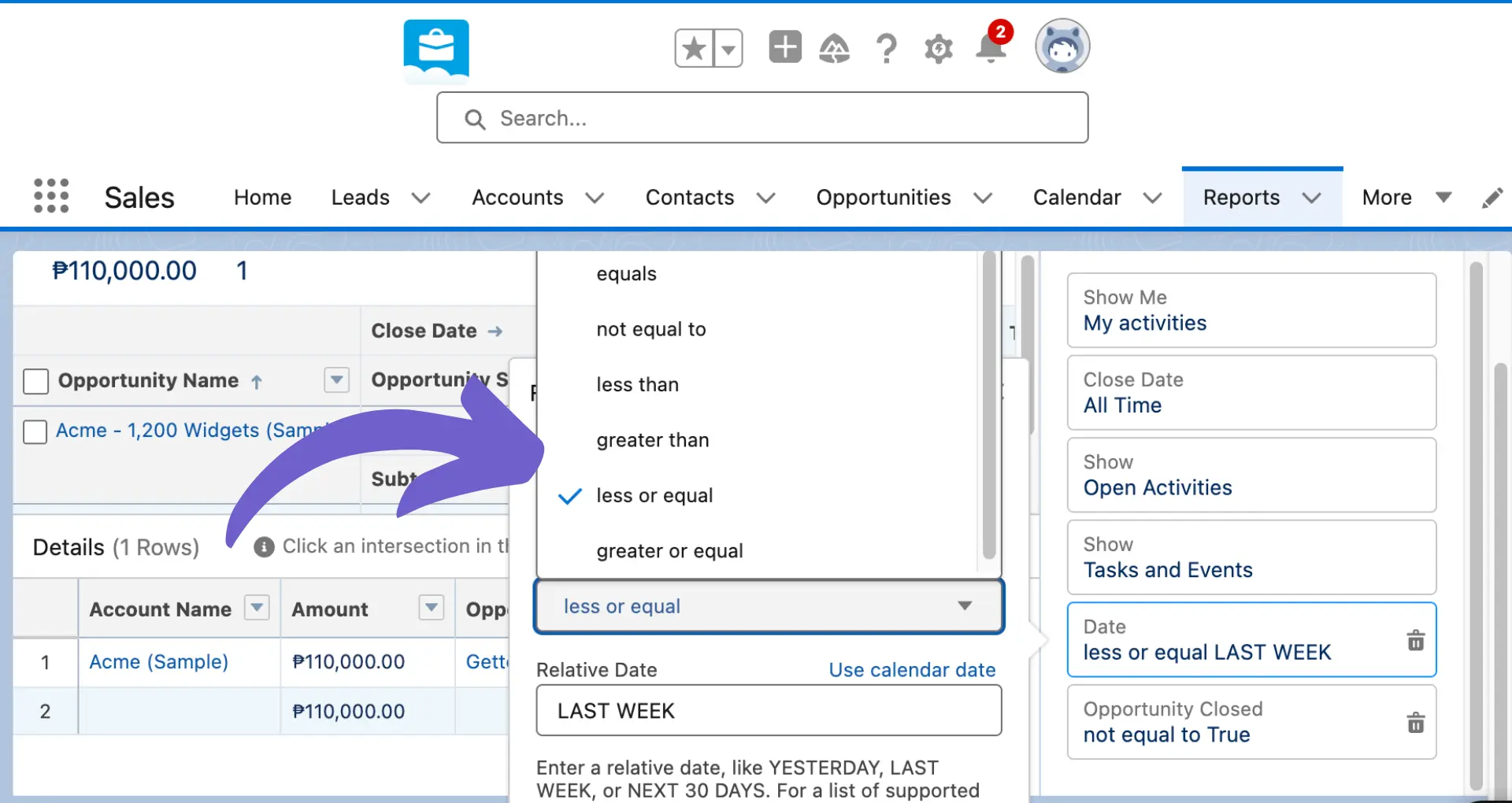 For example, if you want to find all opportunities that are either in the "Closed Won" stage or have an amount greater than $50,000, you would use a combination of the OR operator and two conditions: