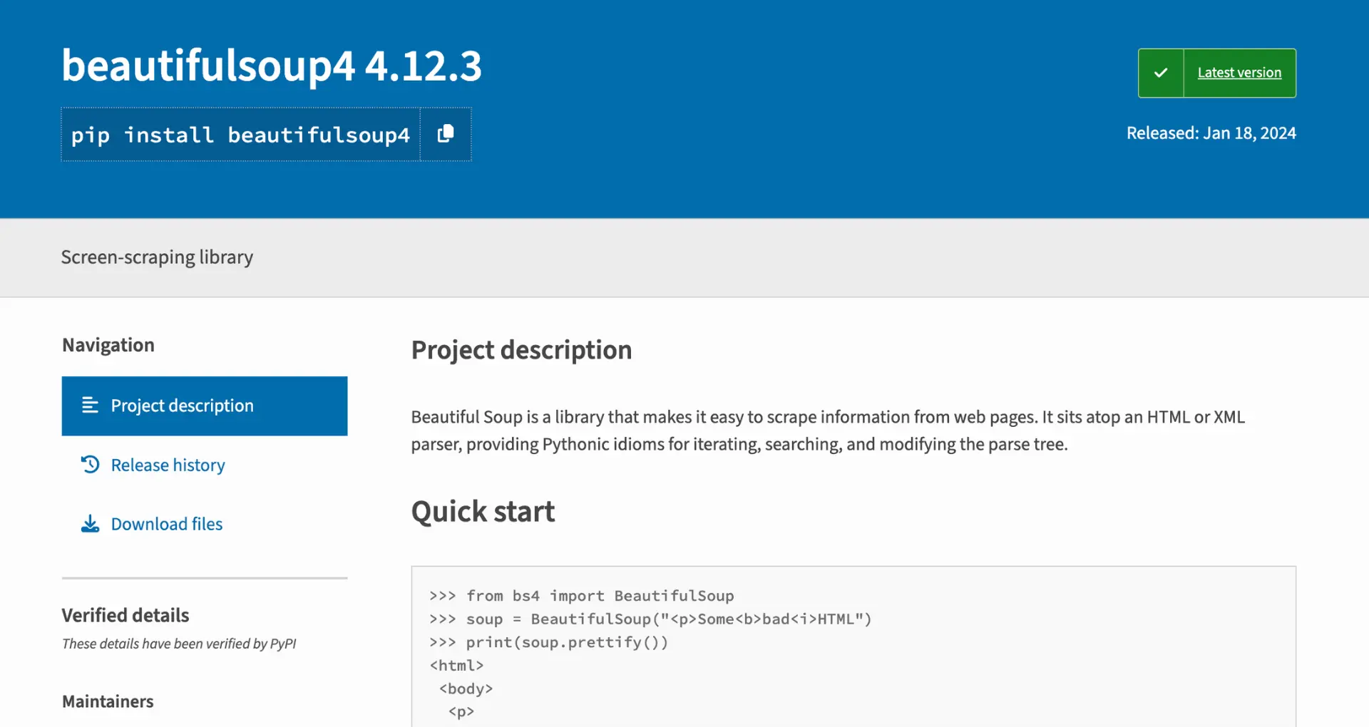 BeautifulSoup is a powerful library that allows you to parse HTML and XML documents, making it easier to extract the desired data from web pages. You can install BeautifulSoup using pip, Python's package installer, by running the following command in your terminal or command prompt: