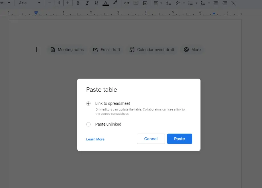 Note: If you choose Paste unlinked, the table will not link back to the Google Sheet, and updates in the Sheet will not reflect in the Doc.