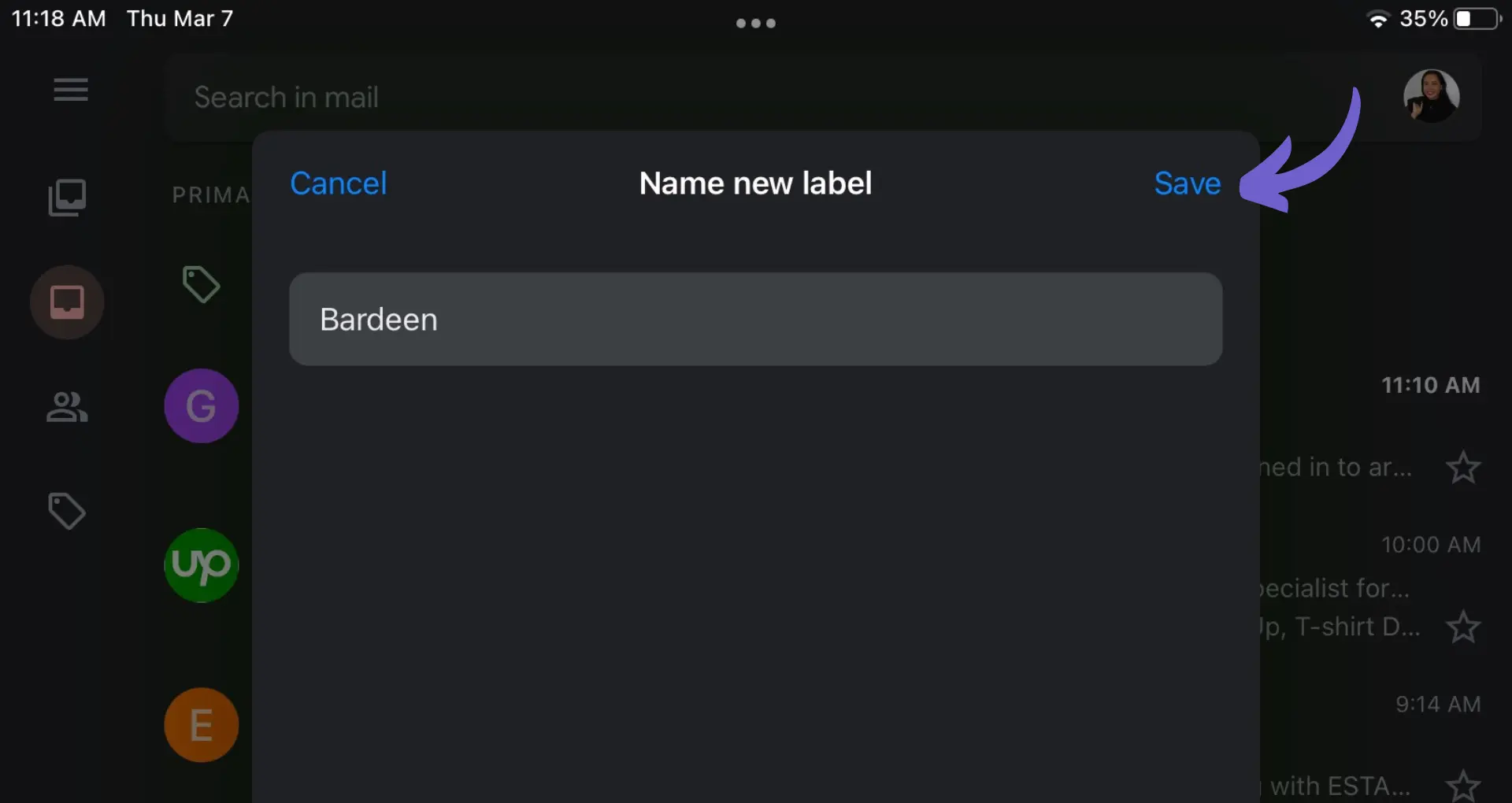 8. Enter a name for your new label and tap 'Create'. If you don't see a field to type in, tap 'Create new label' first.