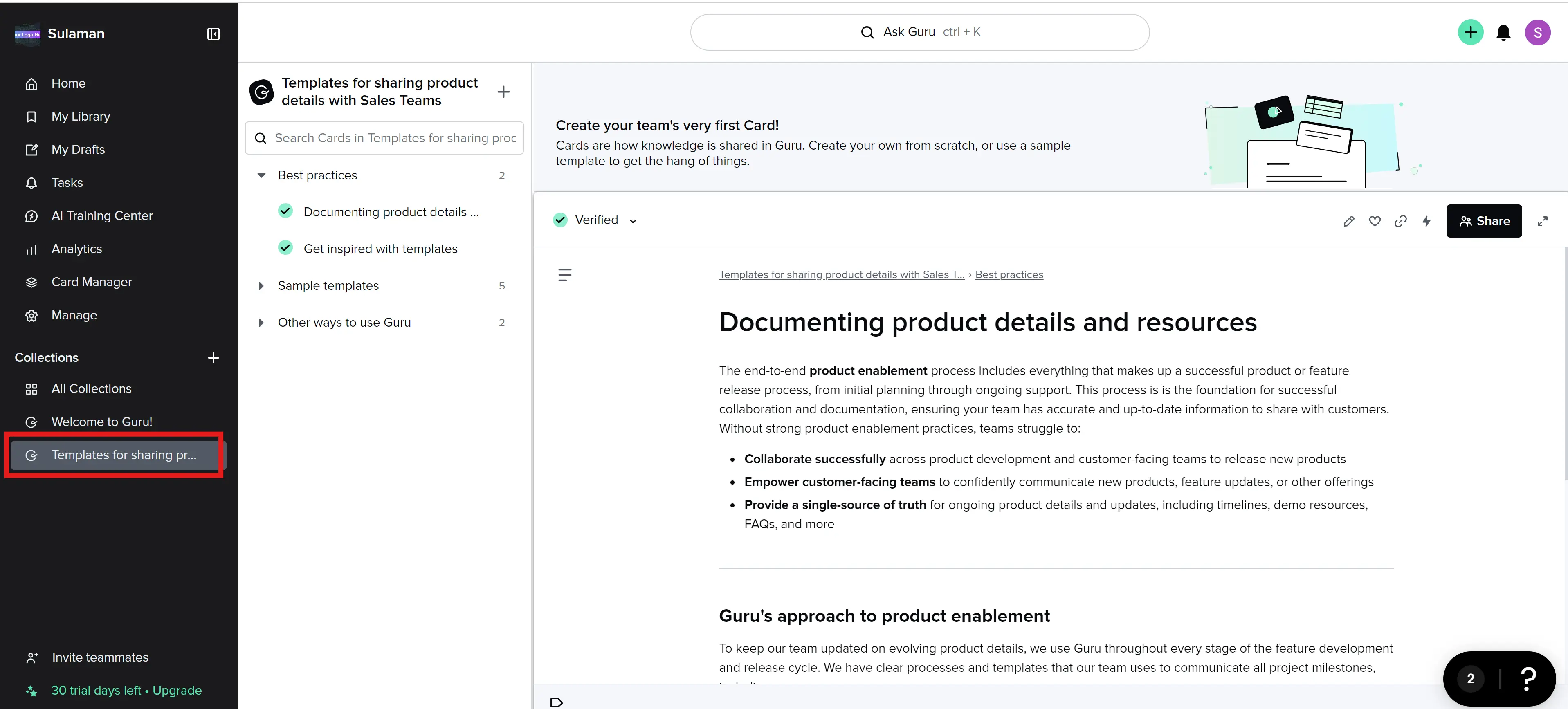 Guru is a knowledge management platform that helps teams create, compile, and organize content from different sources and deliver them to other team members and customers. Its ability to centralize knowledge and make it easily accessible can significantly enhance team productivity, making it a valuable tool for sales enablement.