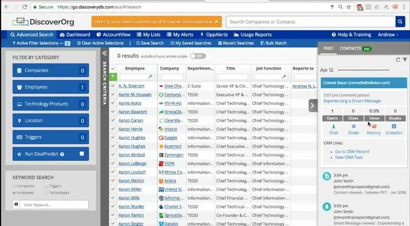 DiscoverOrg is a reliable B2B prospecting tool packed with accurate, deep, and complete data on your top targets. It provides direct access to essential contact info and predictive intelligence to help sales, marketing, and recruiting professionals find, connect, and sell more effectively.