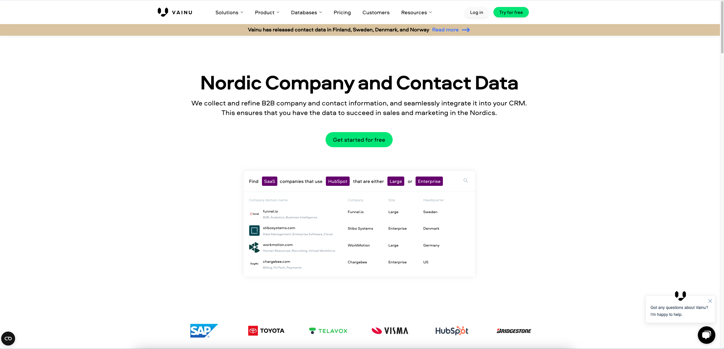 Vainu is a highly-rated B2B business database and sales intelligence software that enables sales teams to identify ideal prospects and monitor key events. With Vainu's extensive company profiles, advanced filtering capabilities, and seamless integrations, users can efficiently find and engage with their target accounts at the right time.