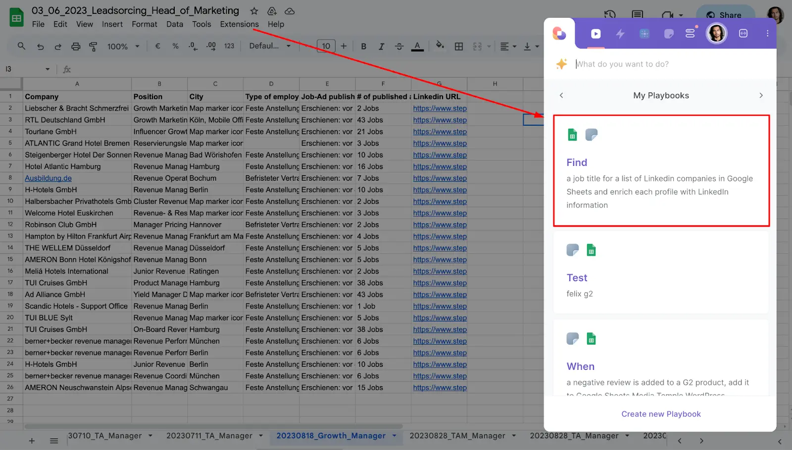 Then, he runs a Bardeen automation to copy-paste all the job positions for “Marketing Managers” with one-click to his Google Sheet.