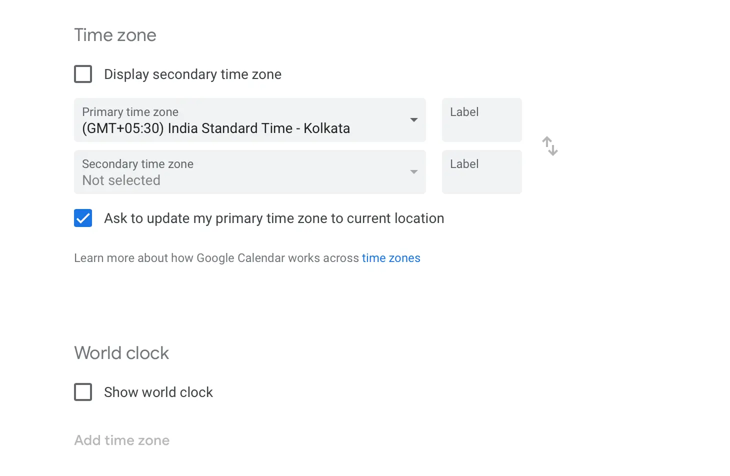 Click on the gear icon and click on Settings. In the Time zone section, you can add a secondary time zone to your calendar. Scroll down further and you’ll see a World clock. It can come in handy if your team is based in different countries.