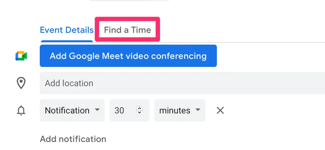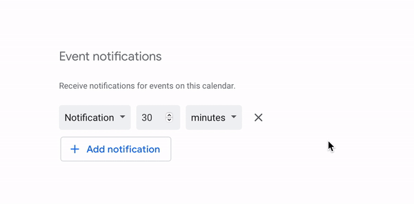 Whether you want to add more notifications or remove the existing ones, you can do that here. To add a new notification, click on ‘+ Add notification’ and specify the time (minutes, hours, days, or weeks) and if you want to receive it via email.