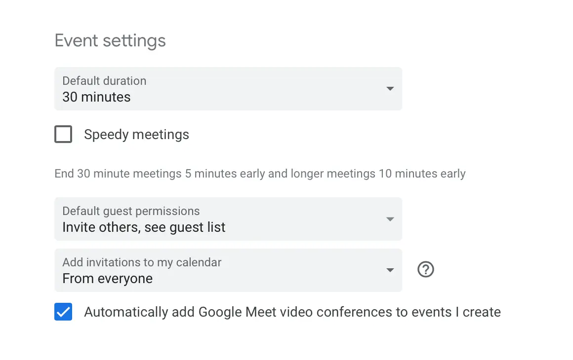 Click on the Default duration button and select your preferred time from the drop-down menu, ranging from 15 to 120 minutes. You can also enable the Speedy meetings feature, which’ll shorten your preset meeting time by around 5 to 10 minutes. In addition to this, setting clear working hours can also improve your work-life balance. Check this Support page for more info on that.