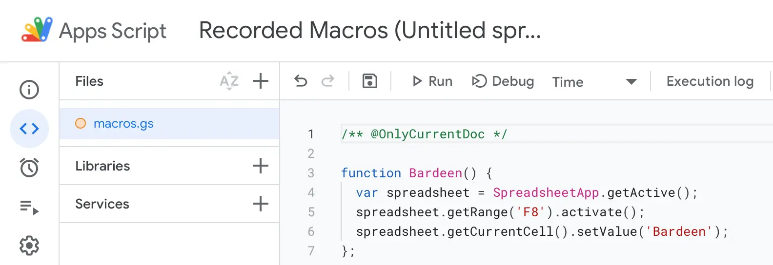 Behind every macro you create is a bunch of JavaScript code. This code, saved in a file named ‘macros.gs’, is attached to the Google Sheets spreadsheet it was created on. If you know your way around JavaScript and wish to modify this code yourself, click on Extensions and Apps Script.