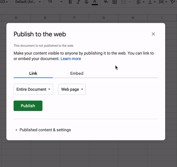 In the pop-up window, you’ll see two tabs: Link and Embed. If you just want a publicly-accessible link to the spreadsheet, go to the Link tab. If you want to embed the spreadsheet to a website, go to the Embed tab. You also have all the necessary options for what data you want to display!