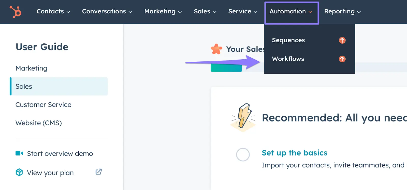 Click Automation in the top-left corner of the screen and Workflows in the drop-down menu.
