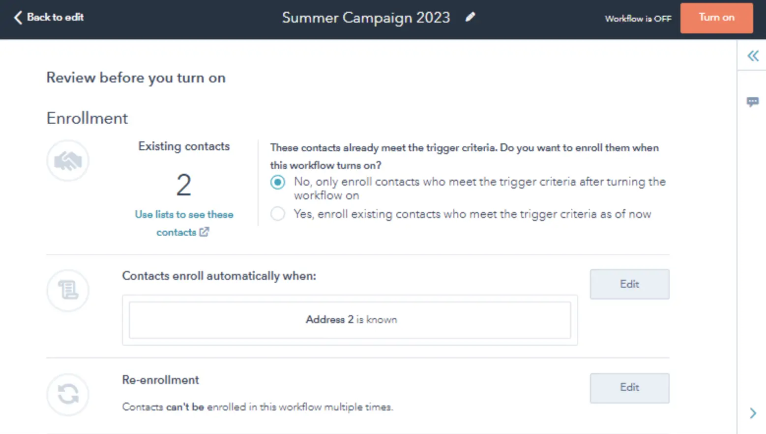 Now, you can turn on your workflow! In the top-right corner, click Review and publish. On this page, review your workflow settings. If everything is good to go, click Turn on.