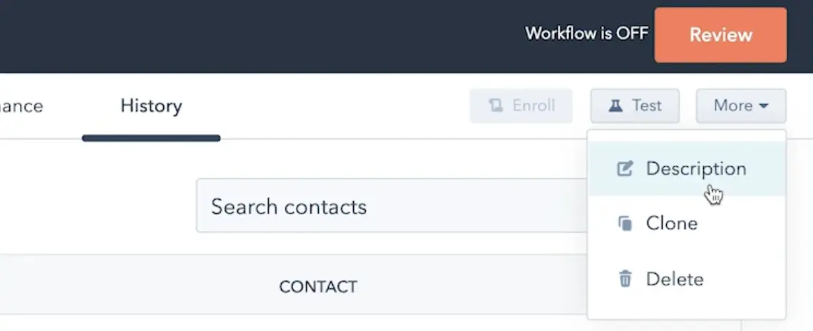 If you want to edit workflows or make major changes, open the workflow and click More in the top-right corner of the screen. This will allow you to write a description for it, clone it, and delete it.