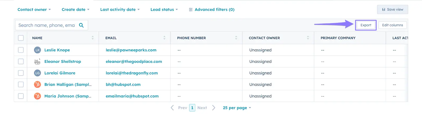 Step 2: Click Export in the top-right of the table. If you only want to export contacts based on certain criteria, click Add view to narrow down the selection.