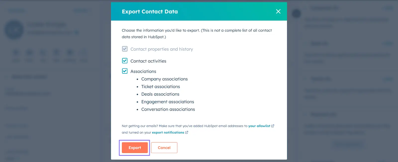 Step 4: In the dialog box, specify the data you want to export about that contact, including activities and associations. Click Export.