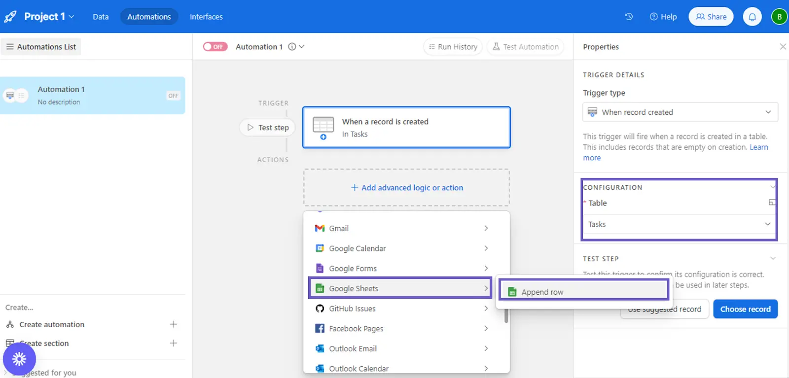 If we choose When a record is added as trigger, whenever we create a new record, it will automatically export the new record to the Google Sheets spreadsheet.
