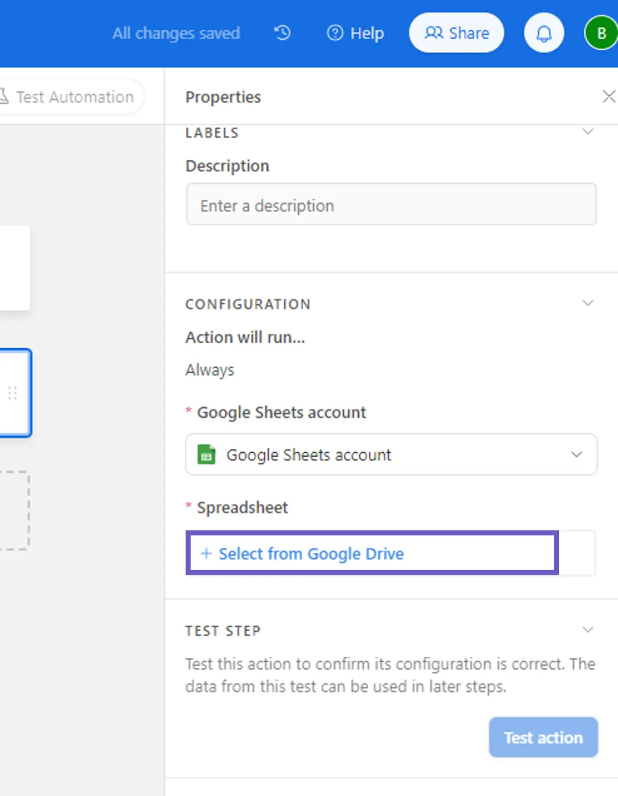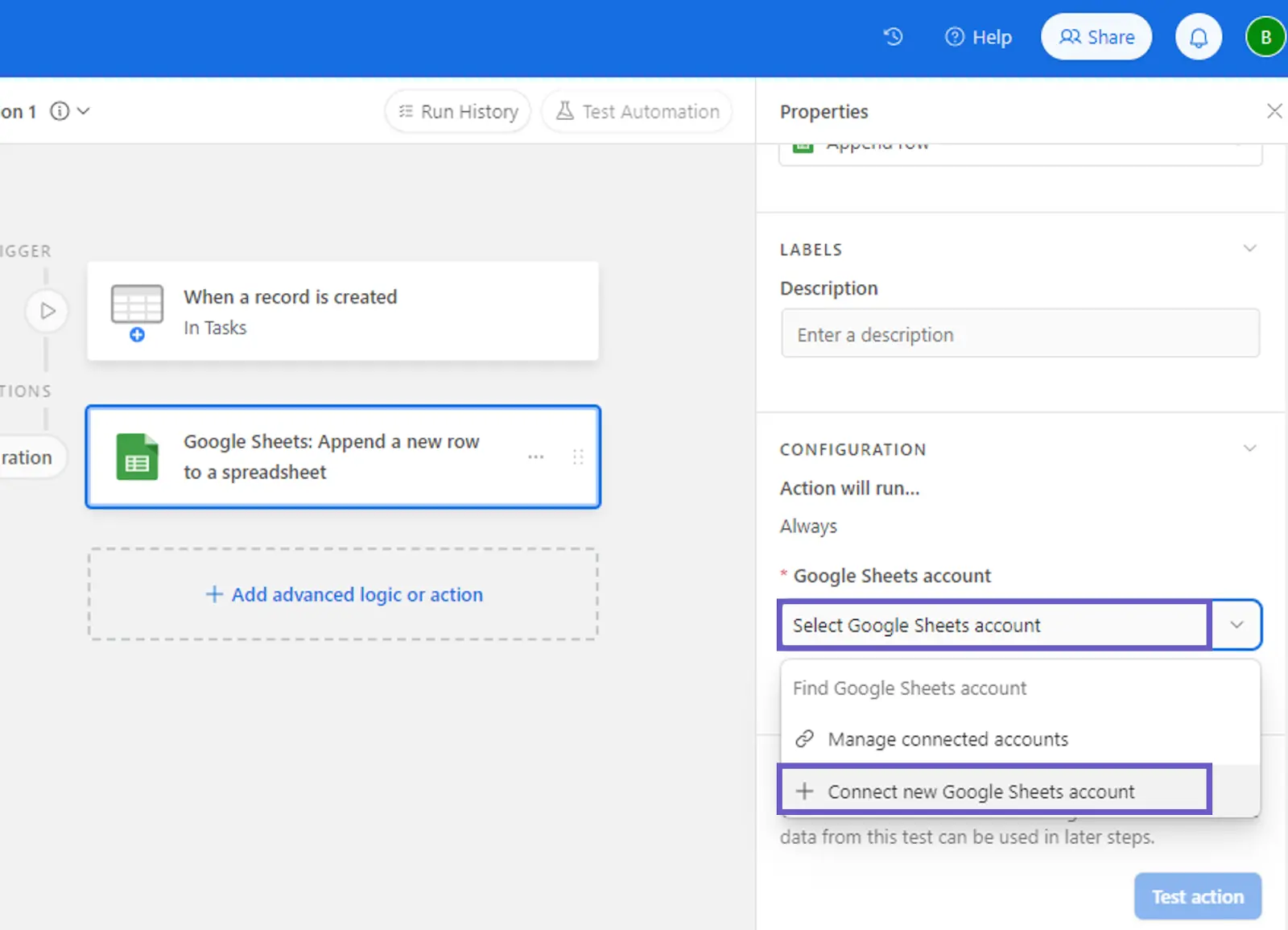 Step 3: Under Properties, link your Google Sheets account and choose a destination spreadsheet. You will need to select Connect new Google Sheets account in the menu.