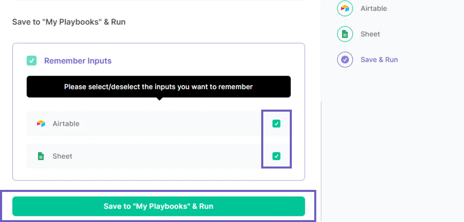 You can click on “Save Input” and checkmark Airtable and Google Sheets to save you time from input in the future. You can also edit “Inputs” later by hovering over the playbook and changing your choices.