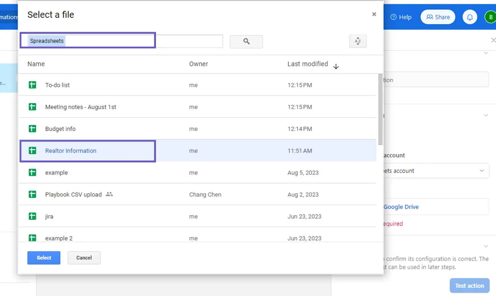 In the window, you can search your spreadsheet by name or scroll down to find it. Click Select once you’ve found it.