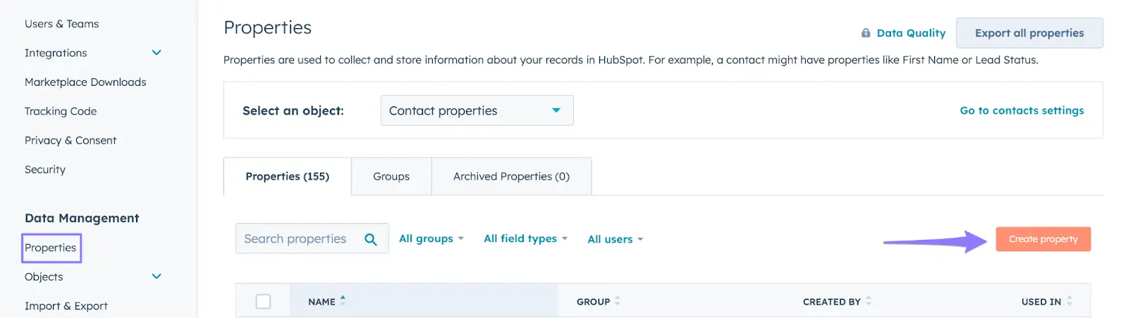 By default, HubSpot has around 150 properties, like First Name, Last Name, Email, Mobile Number, and more. However, you can also add new ones if you want. Here are the steps to add a new property in HubSpot.