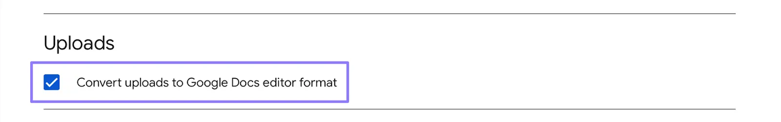 Step 2: Scroll down and enable the Convert uploads option. This will convert the files you upload to Google Drive to Google Docs editor format.