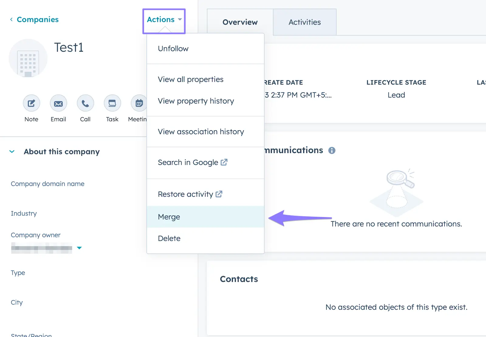 When you merge companies in HubSpot, it results in one company with activities and associations from both primary and secondary companies. However, there are two scenarios in which you can’t merge a company.