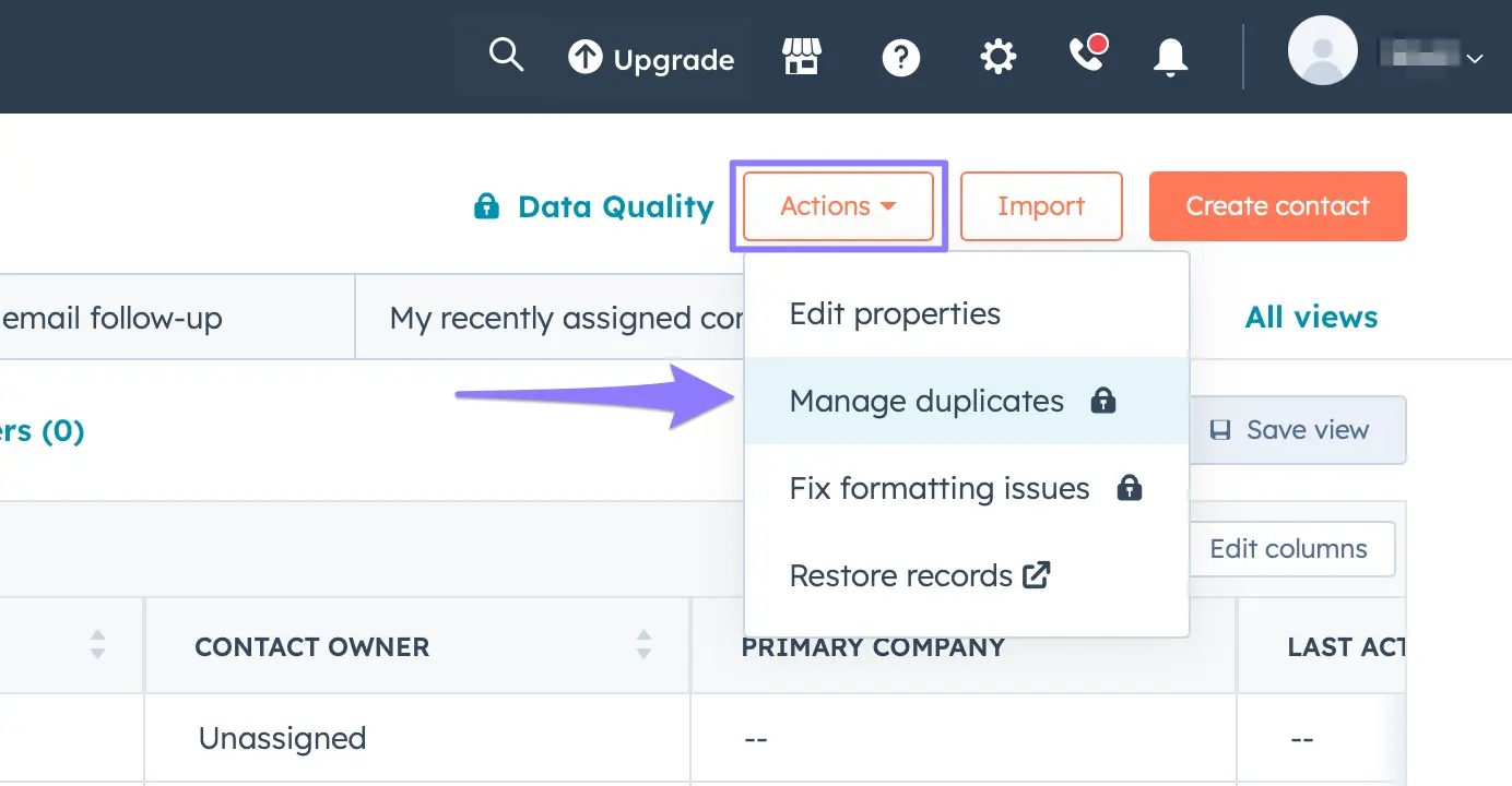 If you have many duplicate records, the above method for merging can be difficult and time-consuming. Instead, you can use the Manage Duplicates feature. Go to your Companies or Contacts home screen, click Actions, and Manage duplicates.