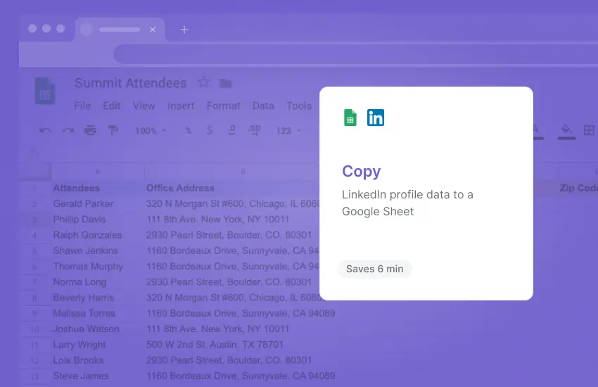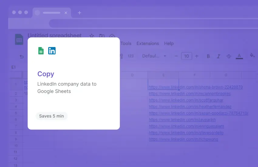 If you want to collect LinkedIn companies in a Google Sheets spreadsheet, use this automation to skip all the copy-pasting! With just a few clicks, it’ll import all the necessary data for a company into any spreadsheet of your choice.