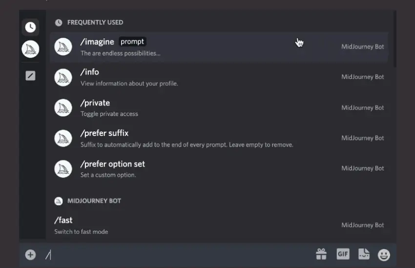 Enter /imagine in the message box, and then type a text prompt, and press Enter or return.
