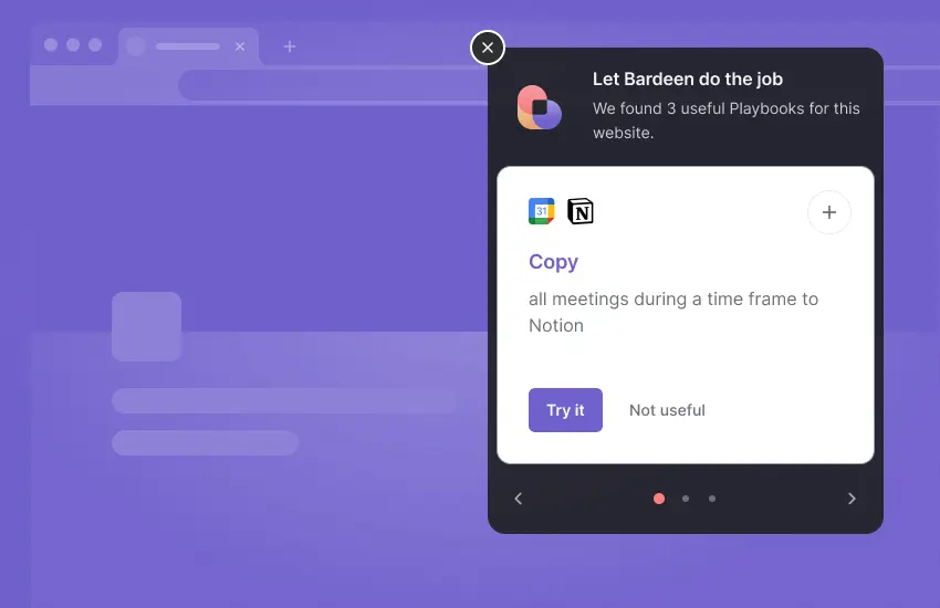 By just switching on this playbook, Bardeen will look out for your next meeting and open it up a minute before it’s due to start. It’ll even pull up a Notion page for the event in another tab, or create one ready for your notes if one doesn’t exist already.
