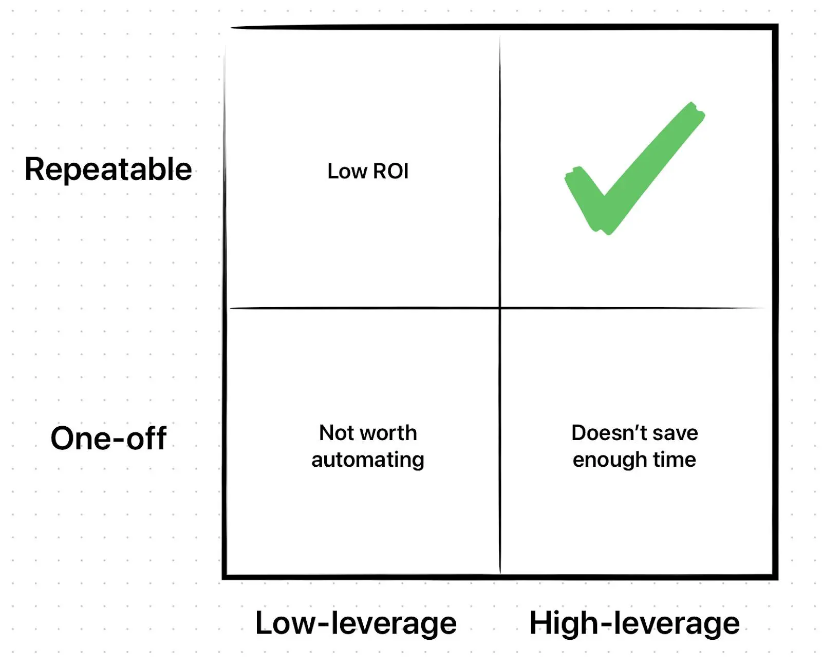 These tasks are high-leverage and repeatable. They’re the best candidates for automation because they’re saving time AND automation is high-impact.