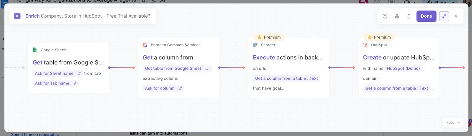 Bardeen is an automation and workflow platform designed to help GTM teams eliminate manual tasks and streamline processes. It connects and integrates with your favorite tools, enabling you to automate repetitive workflows, manage data across systems, and enhance collaboration.
