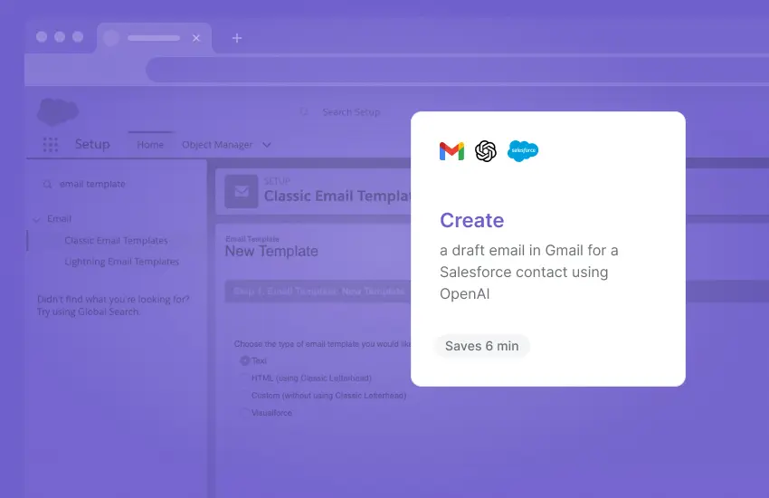 This automation will generate an email (and subject line) in Gmail for any Salesforce contact based on your prompt. It’ll also take the contact’s details into consideration for a more personalized message. Use this automation whenever you want to send an email to a Salesforce contact quickly.