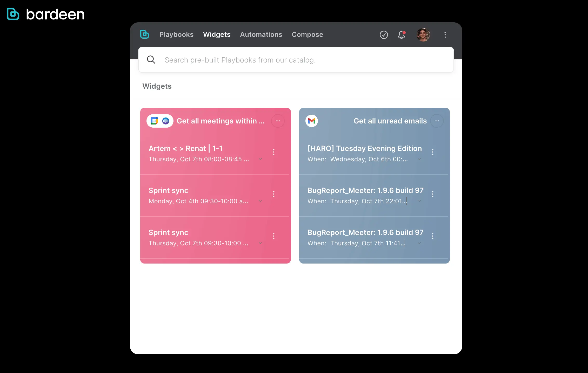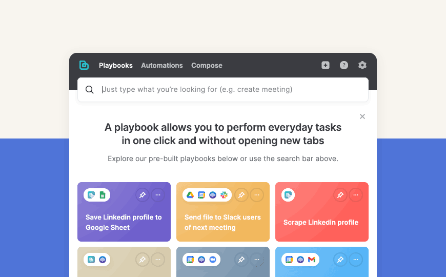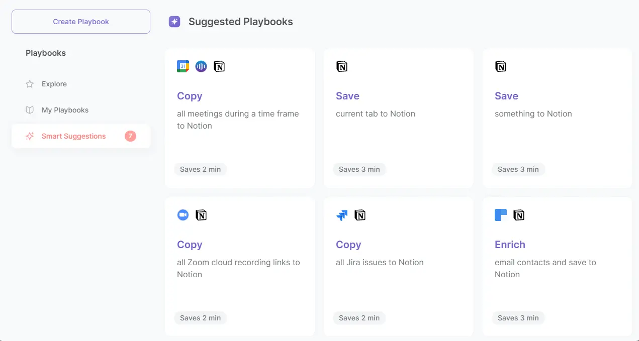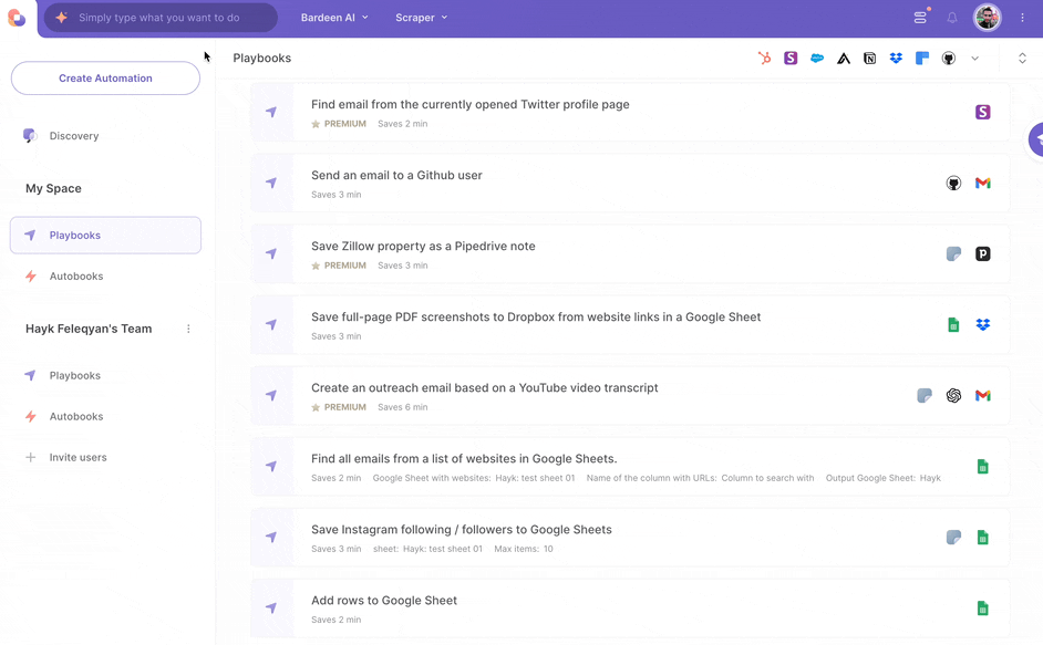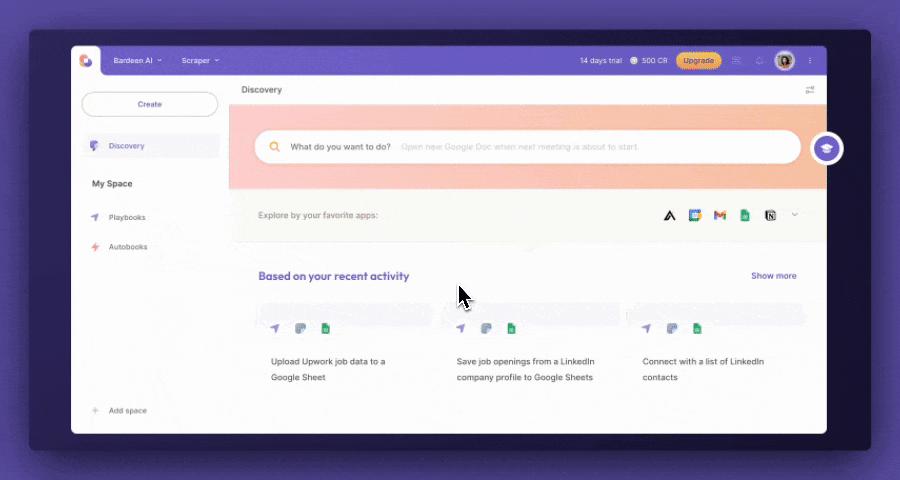 You will be able to discover time-saving playbooks without deliberately searching for them. You can run your workflows regularly, and Bardeen will propose the appropriate playbook for your use case.