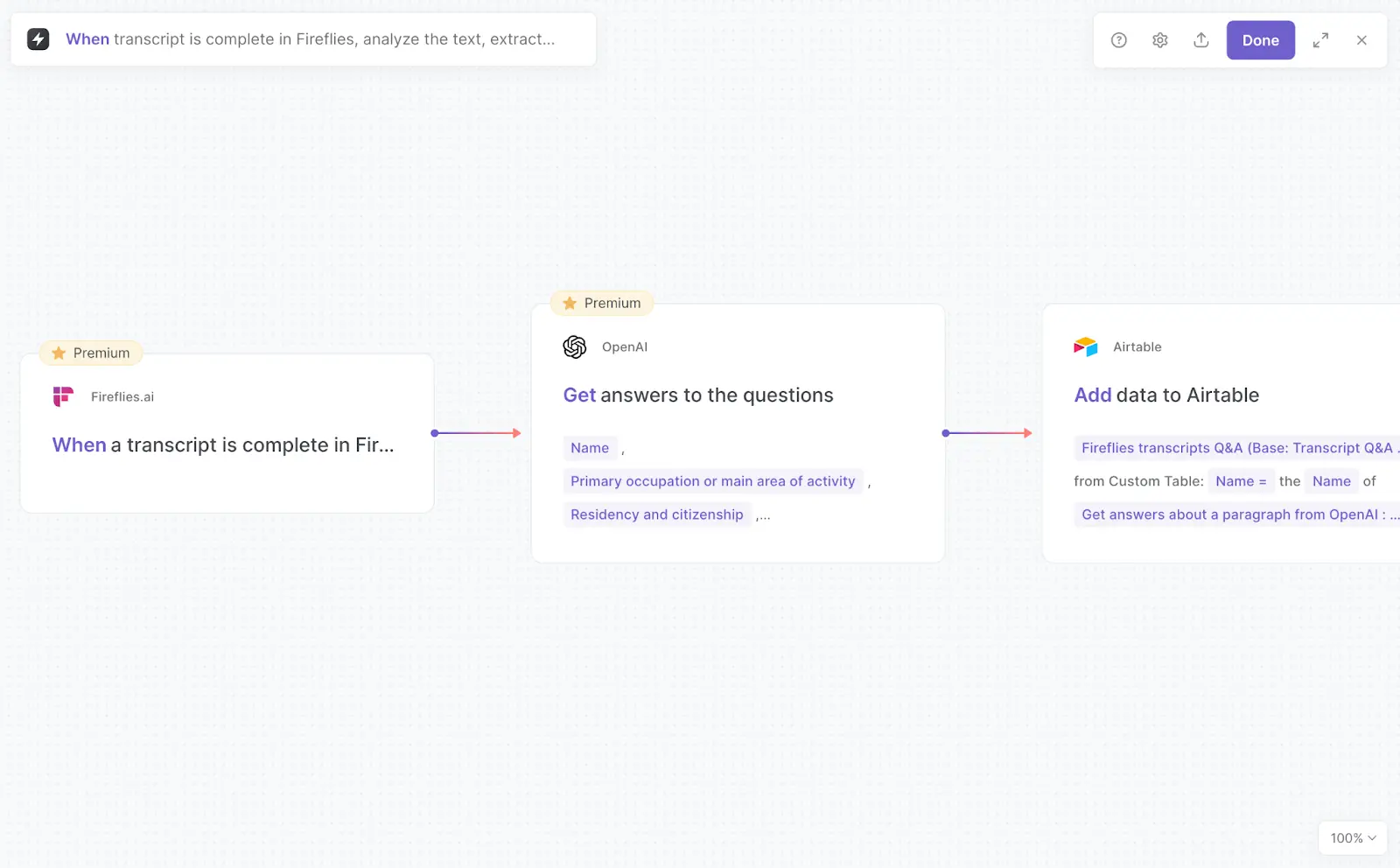The integration can work with both existing and new meeting transcripts. So either use Bardeen to process and analyze your past meetings in seconds, or create an automation that starts each time when a new transcript is available in Fireflies.