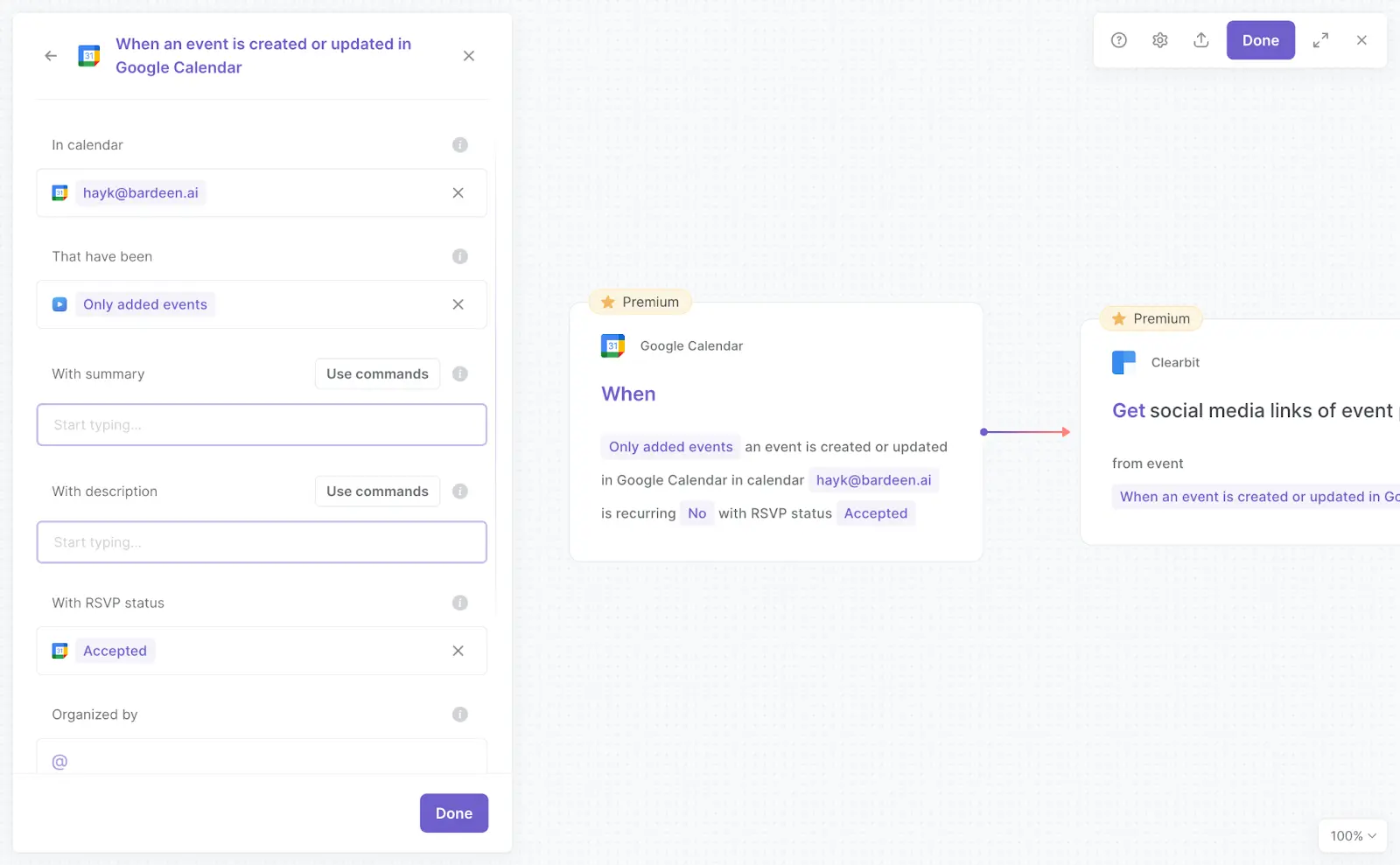 Another new always-on command introduced with v2.53.0 is for Google Calendar. Now you can kick start workflows when an event is created or updated in your calendar. Want to get all information about meeting participants as soon as you accept the invitation? With Bardeen, it’s now easier than ever.